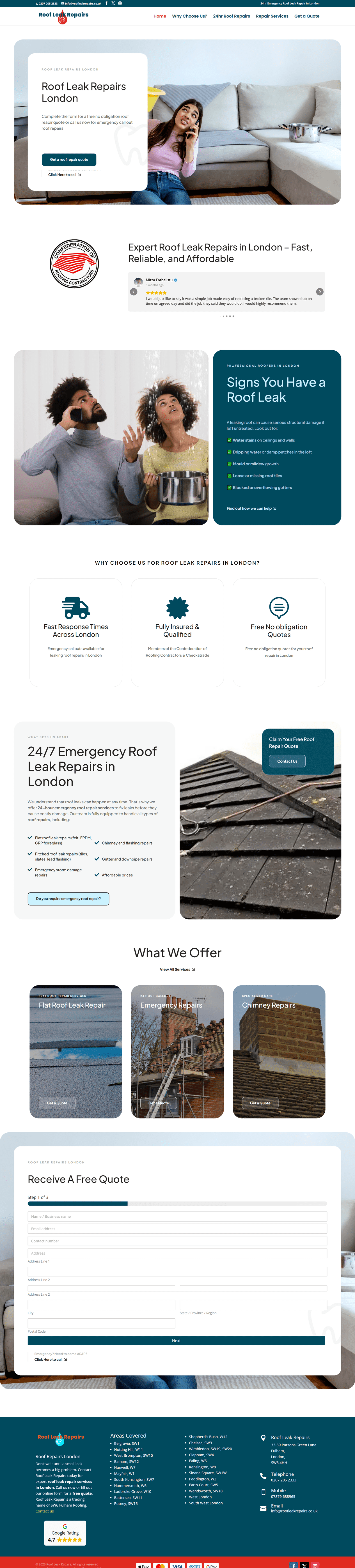 Roof Leak Repairs is London’s trusted expert for fast and reliable roof leak detection and repair. With years of experience, our team handles all roof types, including flat, pitched, lead, slate, and tile. We offer rapid response, 24/7 emergency call-outs, and fully guaranteed work for your peace of mind. From small drips to major leaks, we provide dependable solutions for homes and businesses across London. Contact us today for a free quote.